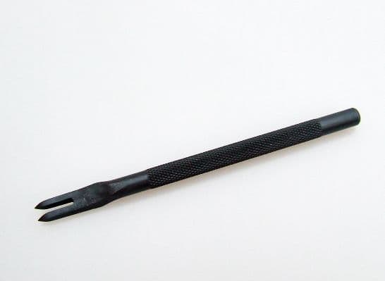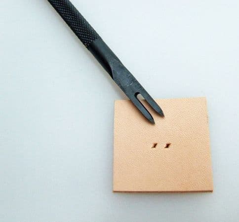 This is 2 prong stitching punch(pricking iron) which covers 3/8" or approx 9.5mm per strike, the spacing between each hole when punched is 4mm, always have a board underneath before striking or your work area will have lots of holes.